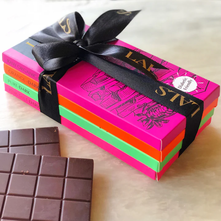 The ideal set for all Dark chocolate lovers includes 4 chocolate bars; Pink Salt Dark, Pure Dark, Raw Organic Dark, and Orange Dark. Handcrafted in Karachi, Pakistan. This is a better-for-you bar that is made with cocoa butter & natural vanilla. It comes in an easy-to-snap bar format in a box you can close for better portion control & sharing.