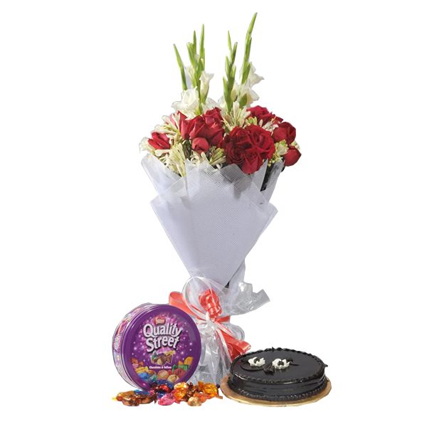 This gift package consists of a beautiful arrangement of mixed flowers including roses, gladioli and carnations. It has 2 dozen flowers in it with green fillers. A bouquet perfect to express your love to your loved one.